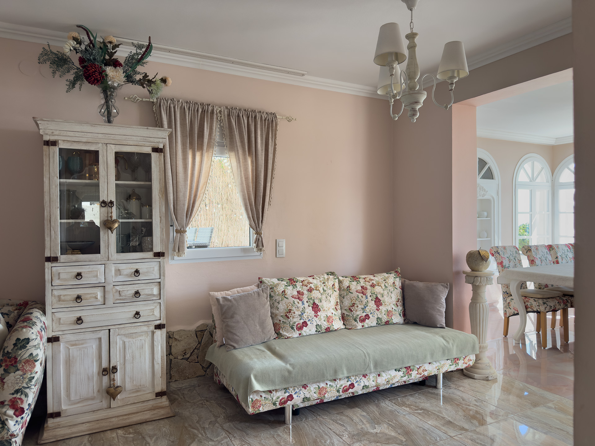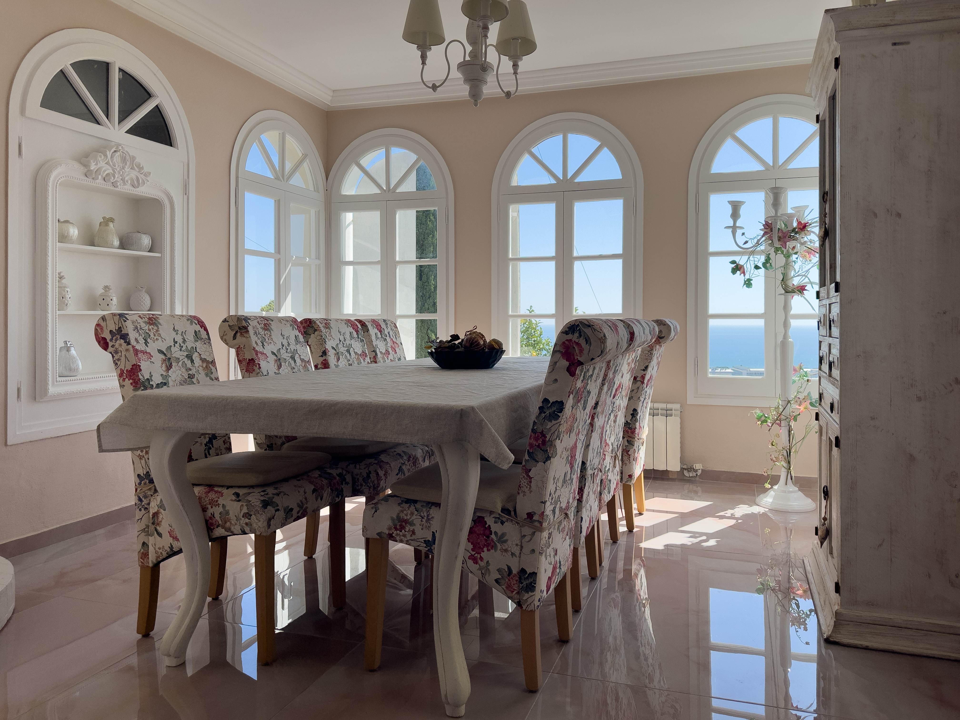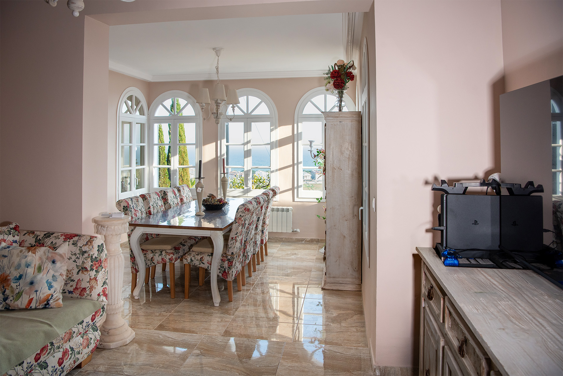 With tall arched windows, soft natural light, and open views towards the sea, the dining area has a character of its own. Elegant without becoming formal, it is a room that makes long breakfasts and shared dinners feel completely natural.