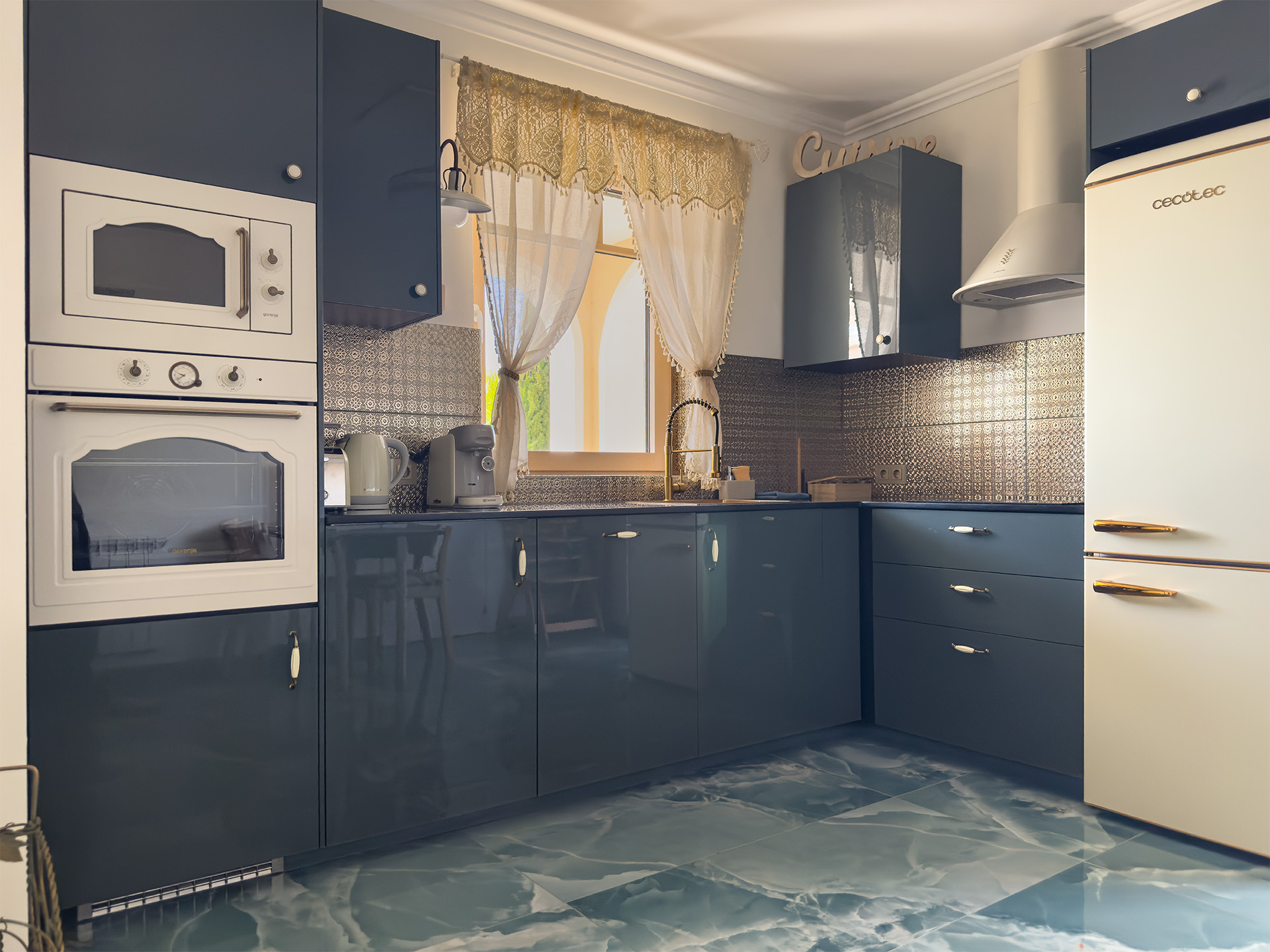 Kitchen has been carefully renewed — brought up to date without losing the warmth that makes it feel lived-in and genuinely welcoming. Soft light, classic lines, and well-chosen details give it a calm, unhurried atmosphere. Fully equipped for everyday cooking, it flows naturally into the adjoining terrace: a quiet spot for morning coffee, a light meal, or a few unhurried minutes in the open air.
